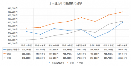 令和4年度の後志広域連合における国民健康保険被保険者1人当たりの医療費は399,464円となっており、新型コロナウイルスの影響により医療機関の受診を控える被保険者が増加した令和2年度は一時的に減少しましたが、令和3年度以降は増加傾向にあります。